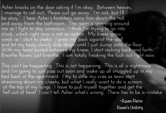 Asher knocks on the door, asking if I’m okay. Between heaves, I manage to call out, “Please just go away. I’m sick, but I’ll be okay.” I hear Asher’s footsteps carry him down the hall and away from the bathroom. The room is spinning around me as I fight to stay conscious. I think I’m trying to go into shock…which, right now, is not an option. My knees grow weak as I start to shake. I press my back against the wall and let my body slowly slide down until I just slump onto the floor. With my head buried between my knees, I start rocking back and forth. Breathe, Raven, just breathe. I am totally freaking the fuck out right now.